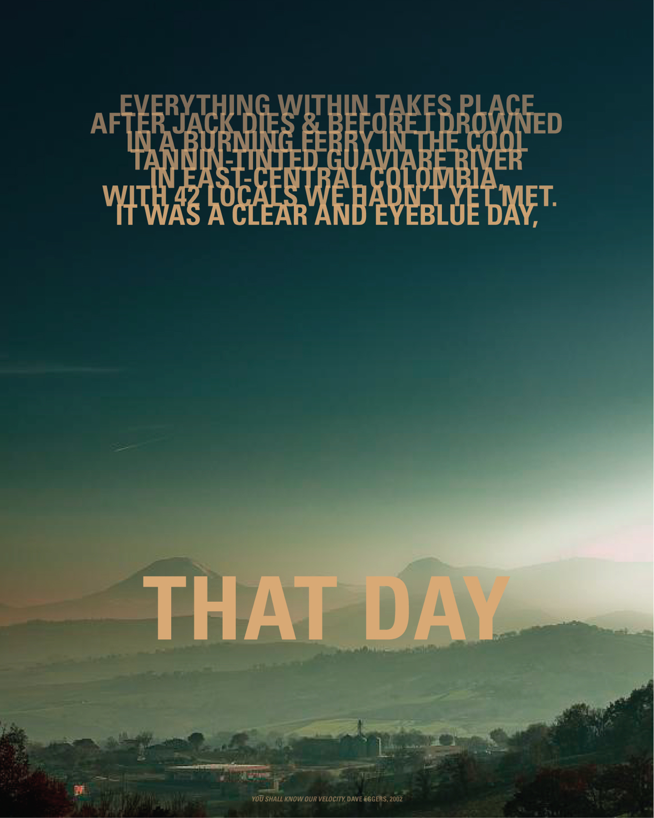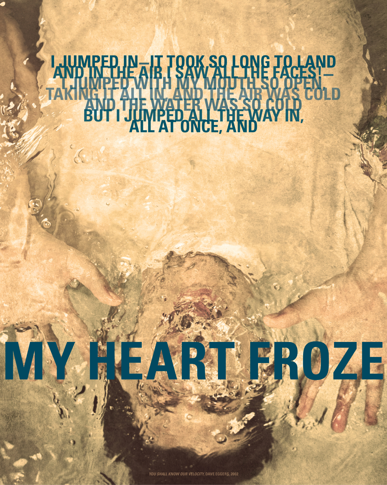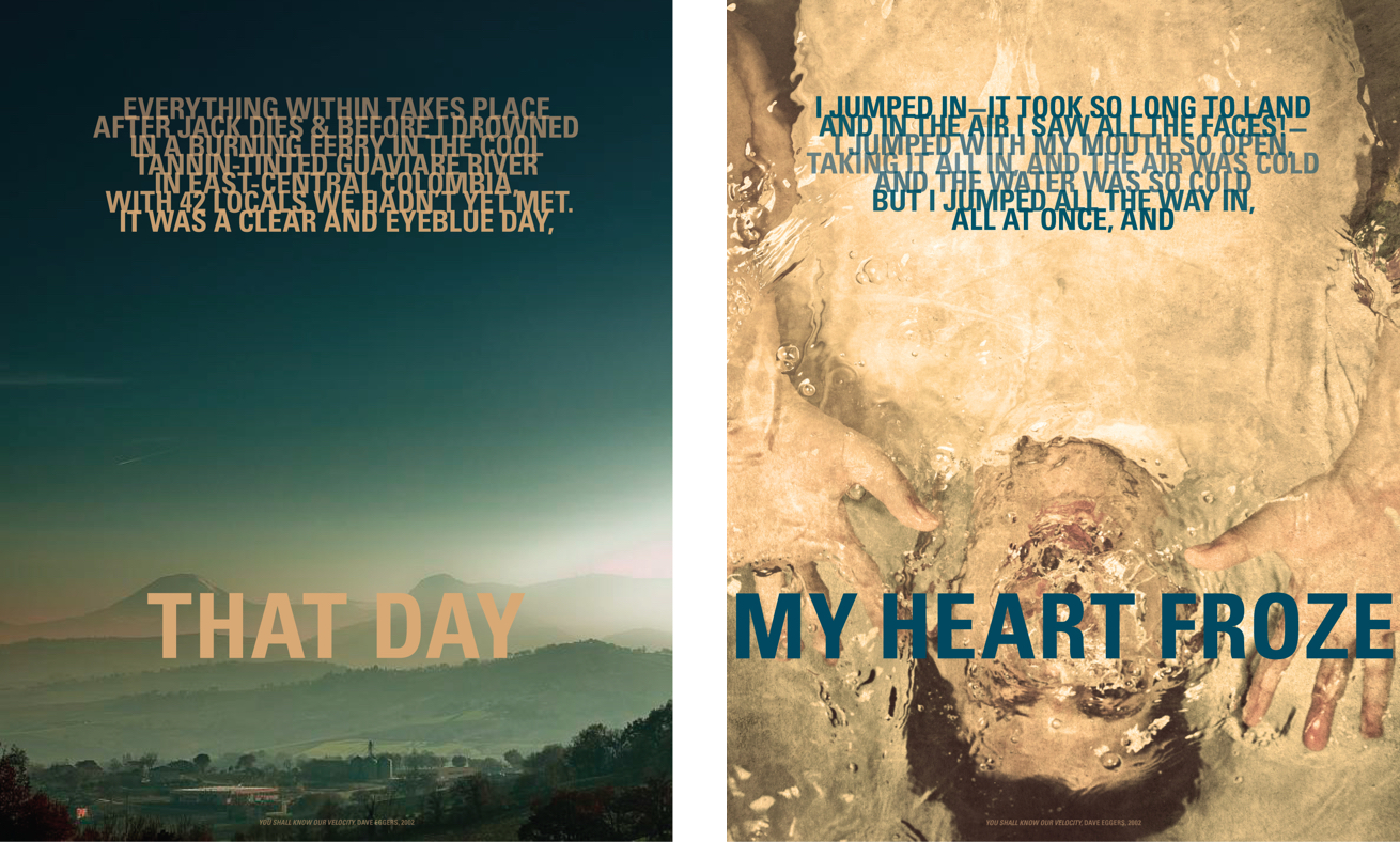This pair of posters was designed to capture the adventurous, emotional energy that is present throughout Dave Eggers’ 2002 novel, You Shall Know Our Velocity. The novel follows two childhood friends who set out on a weeklong, around-the-world odyssey to give away a large sum of money.