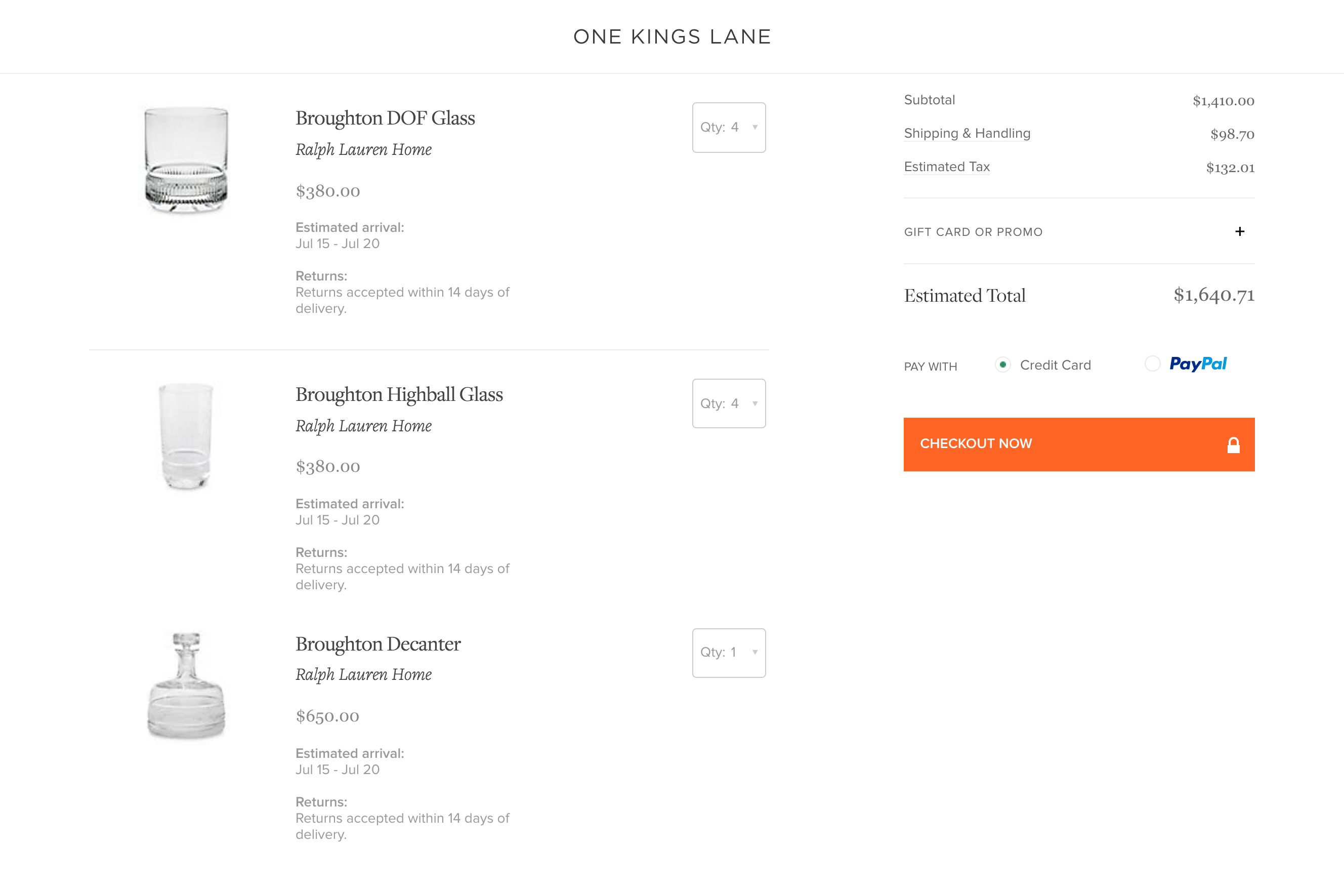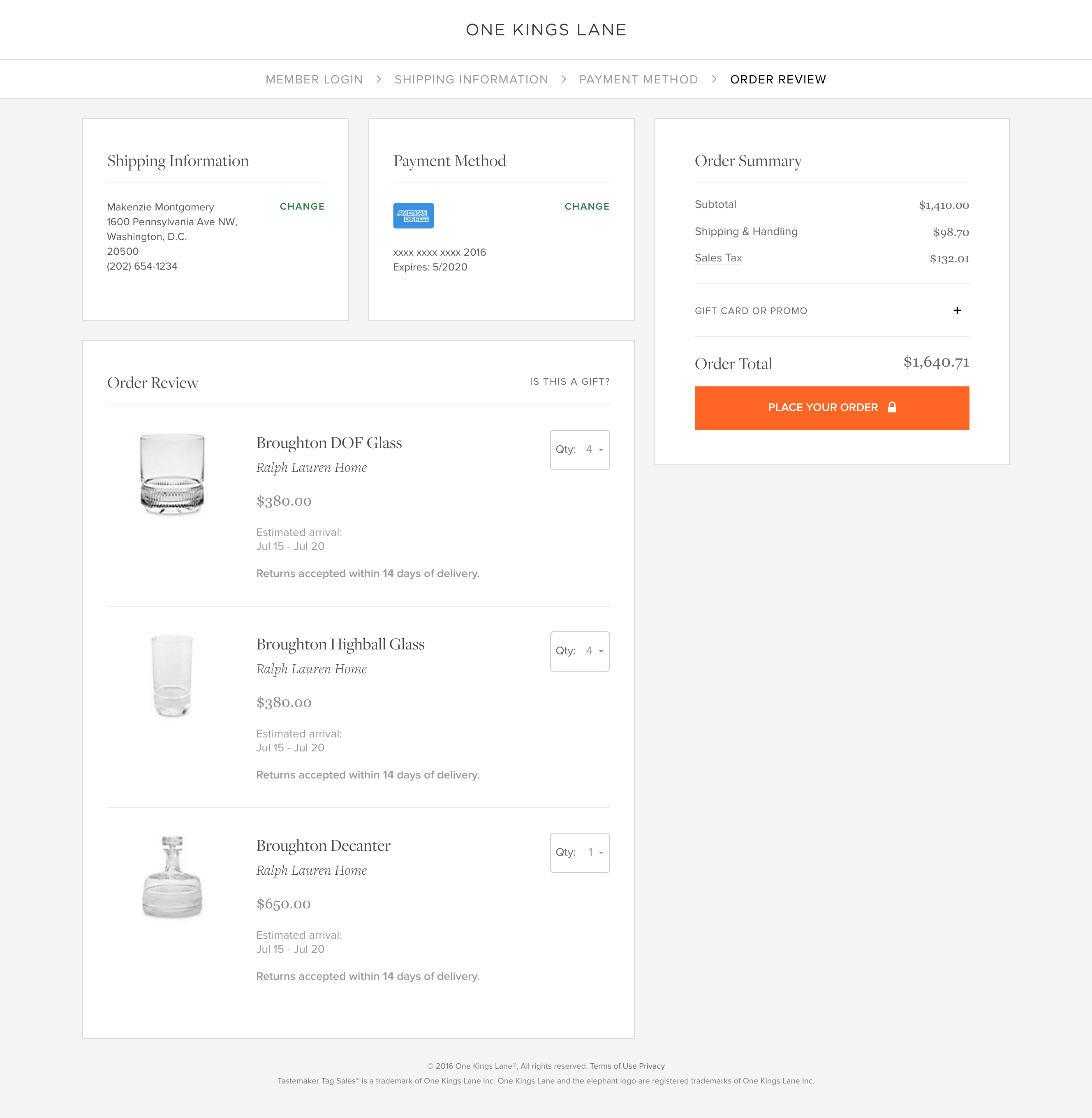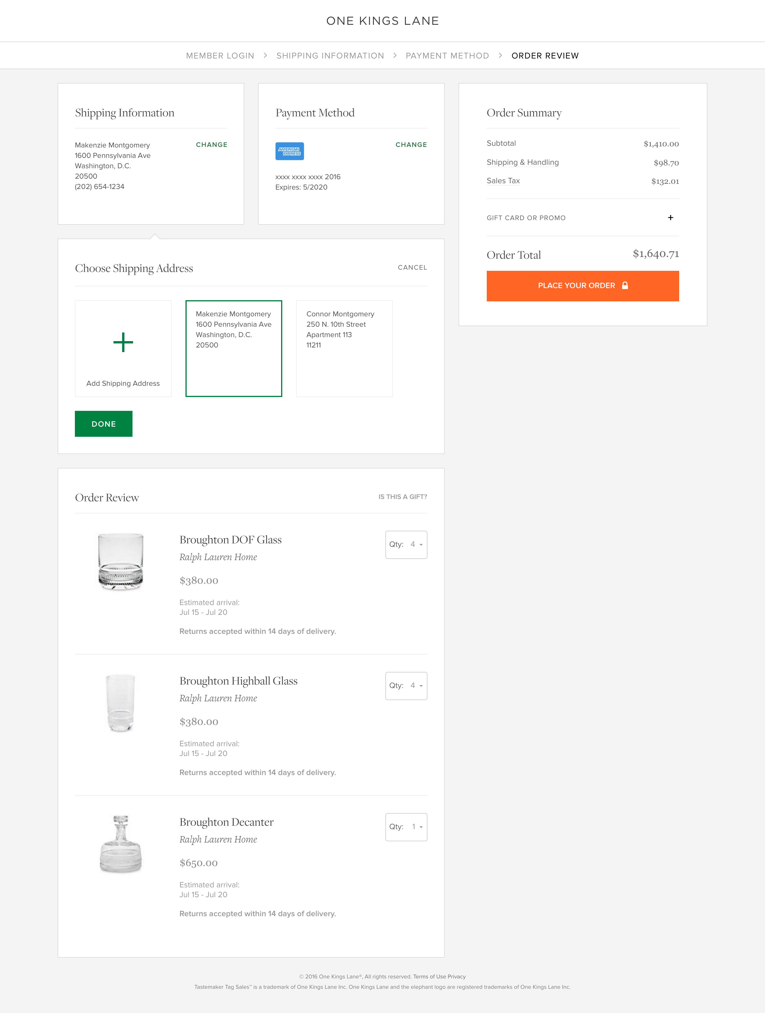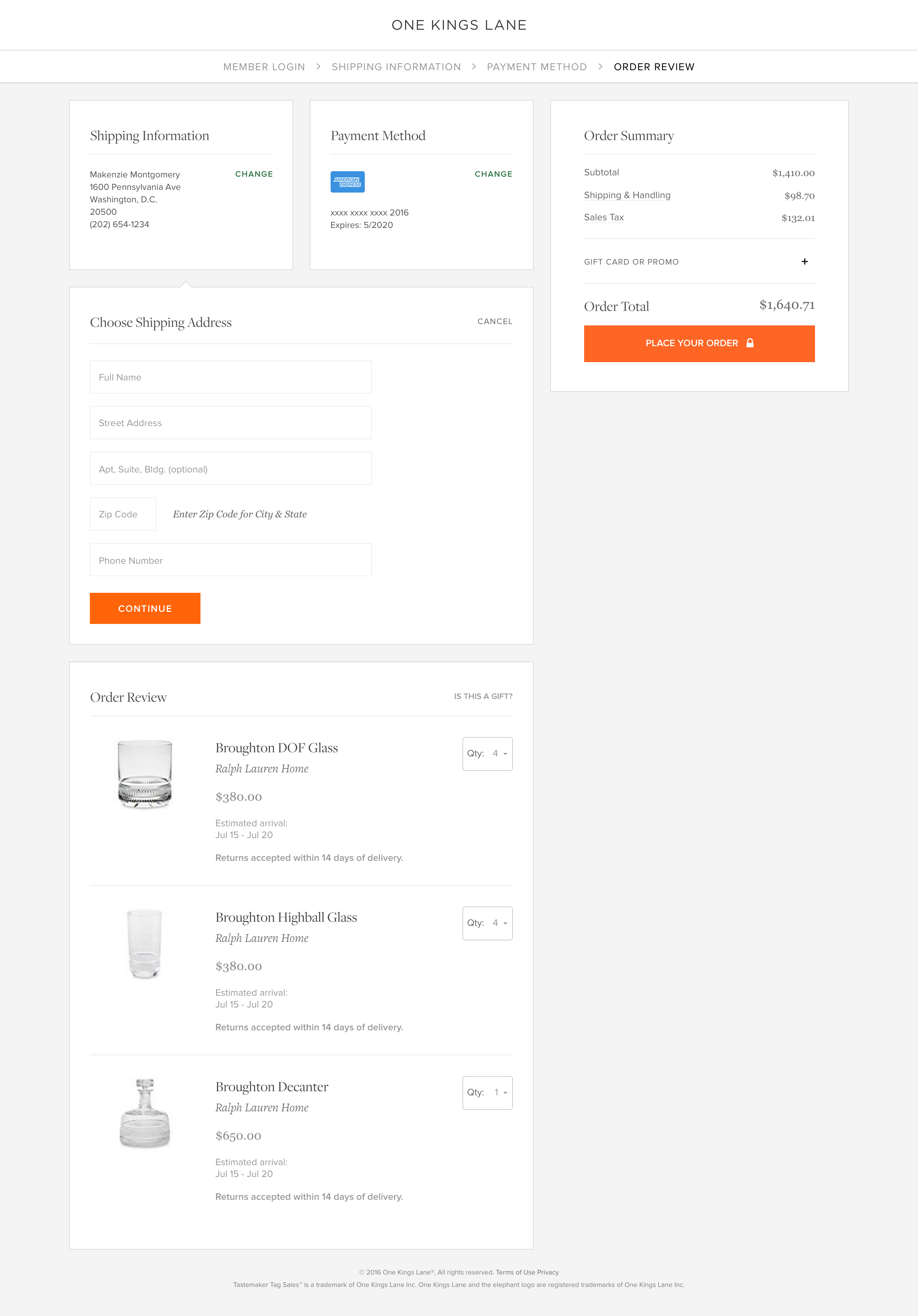 Along with a UX designer, product owner and team of engineers, I was tasked with the redesign of One King’s Lane’s checkout experience. Our goals were to increase conversion, unify the visual design of the site, build a faster, more secure experience and to create a responsive system that could serve our customers at all viewports. I was responsible for bringing the brand’s elegant and clean visual identity to a section of site that once felt detached from the rest of the experience.