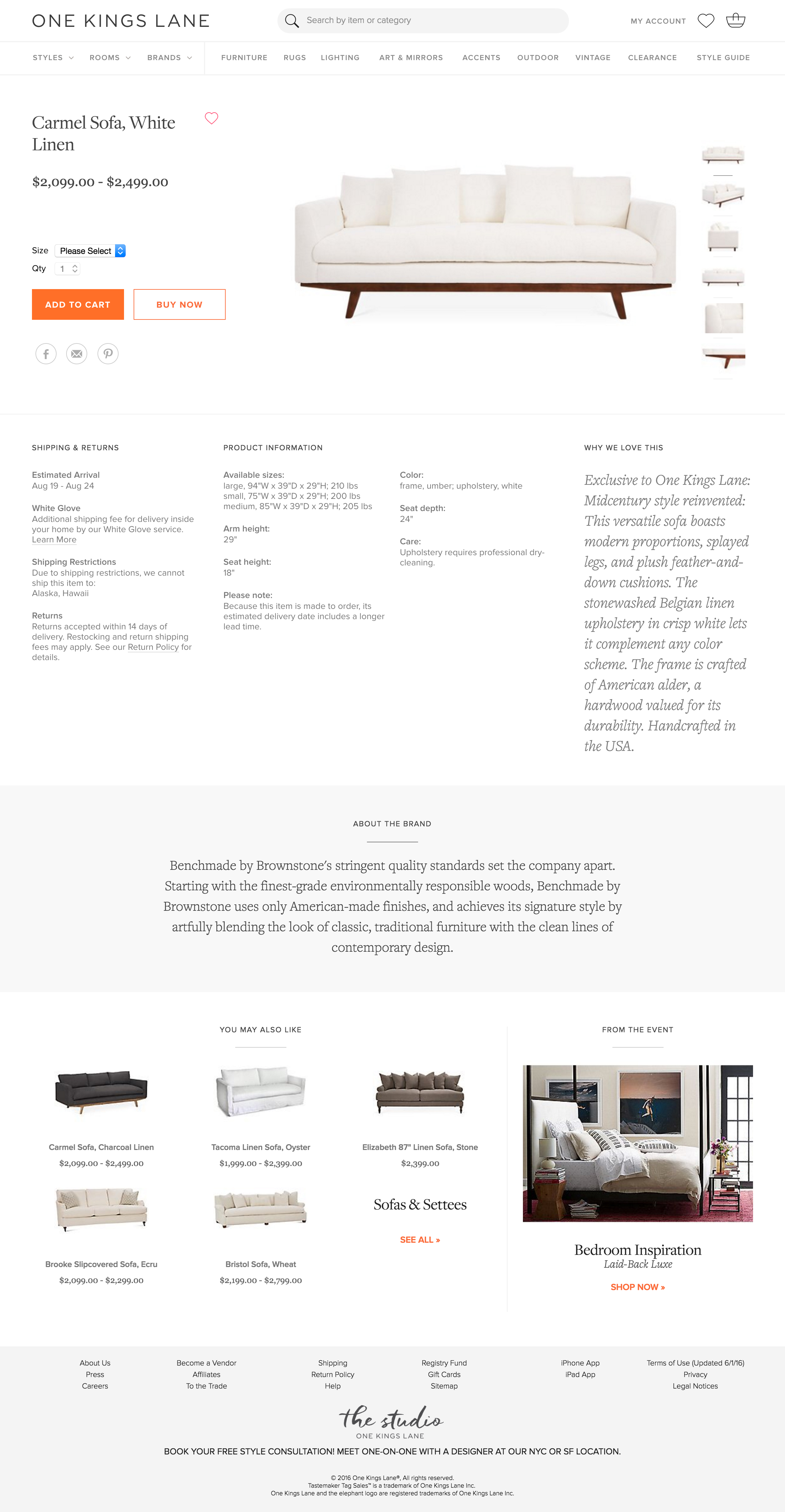 The product detail page of an ecommerce site is crucially important to both the user experience and to the success of the business. For One King’s Lane, the template needed to be flexible enough to sell a large variety of home goods and it needed to provide enough information that a customer was confident in making a purchase without seeing it in person. While the whole page was overhauled, a few big changes accomplished both of these goals. We increased the width of the page, utilized a new site-wide typography and implemented a grid system that increased the product image size. The information architecture of the page was reconsidered to allow our merchant team to highlight key information depending on the item’s category. Most importantly, the page was designed in a modular fashion that allowed us add functionality without needing to rethink the design. The new design received praise from enthusiastic shoppers and increased key business metrics.