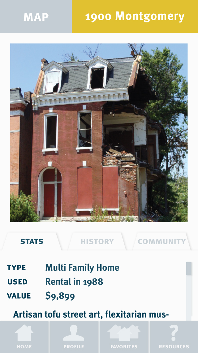 Restore STL is the result of a three week long workshop in which my team was challenged with prototyping a mobile application that gives the citizens of St. Louis, Missouri access to civic data. We created an app that focused on the large-scale problem of abandoned properties in St. Louis. The goals of the app are to educate citizens, connect individuals who are interested in restoring the city and reduce the time and effort it takes to access civic data about abandoned properties.