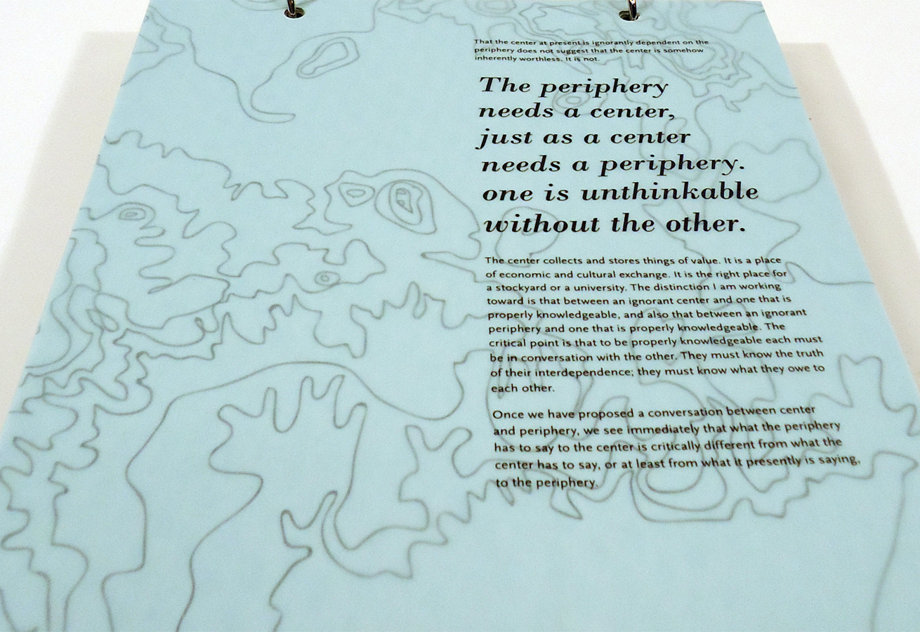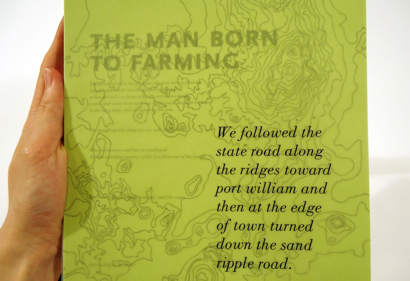 Wendell Berry is a farmer and the author of more than thirty books of fiction, non-fiction, and poetry. Berry’s work is an ongoing exploration of man’s use of and relationship to the land. This book highlights a selection of his work that relates directly to the distance, both figuratively and literally, between people and their environments. The concept of distance is further explored in the book's visual language of topographic maps, aerial photography, and transparency.